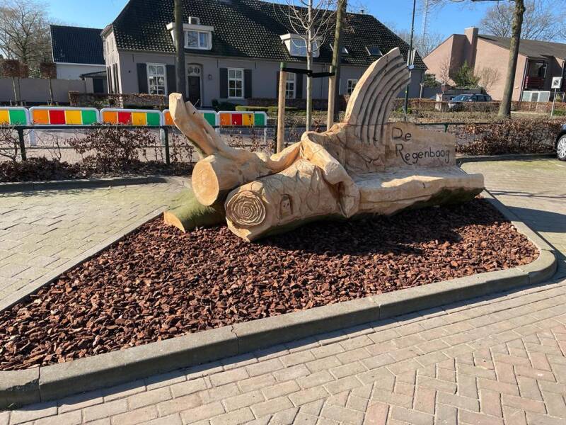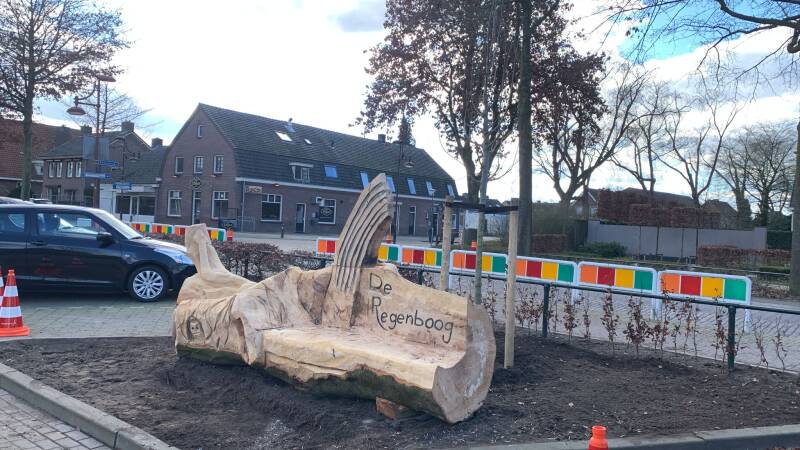 De bank is geplaatst op de parkeerplaats van basisschool "De Regenboog".