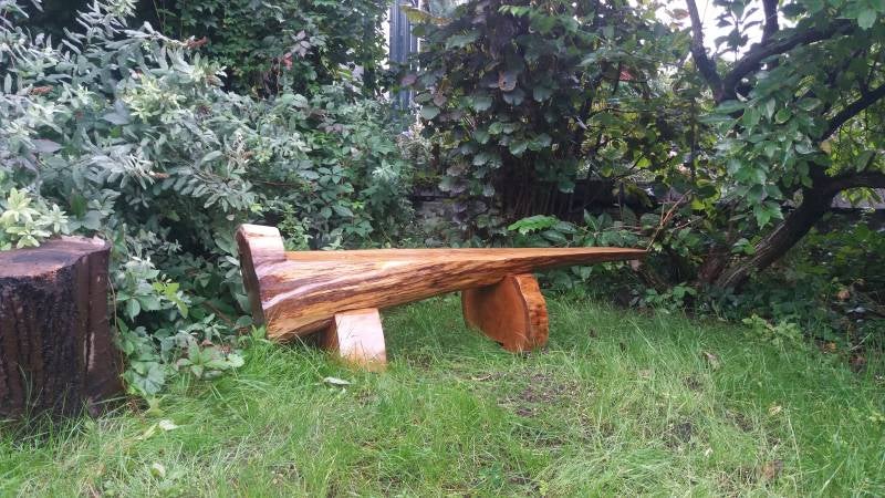 Twee jaar geleden ben ik begonnen met de bank door een boomstam diagonaal door te zagen.