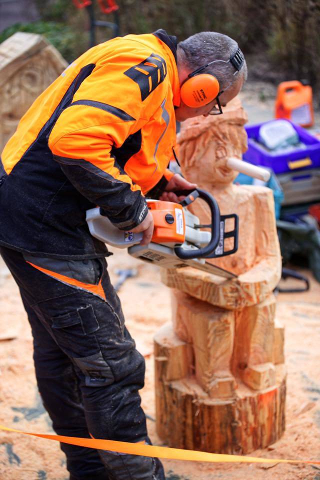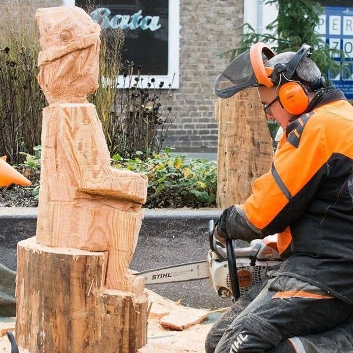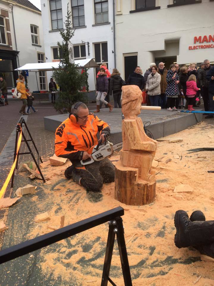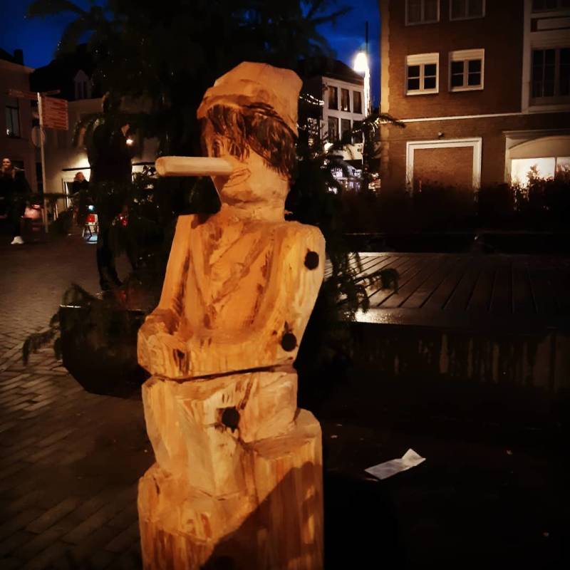 De straat waar wij stonden , De Nieuwstad, werd het sprookje Pinokkio uitgebeeld. Vooraan de straat kregen wij een mooie plek aangewezen waar wij een pinokkio konden maken. Het stuk hout wat we gebruikten was een stam Douglas van 40 cm dik en ruim 120.